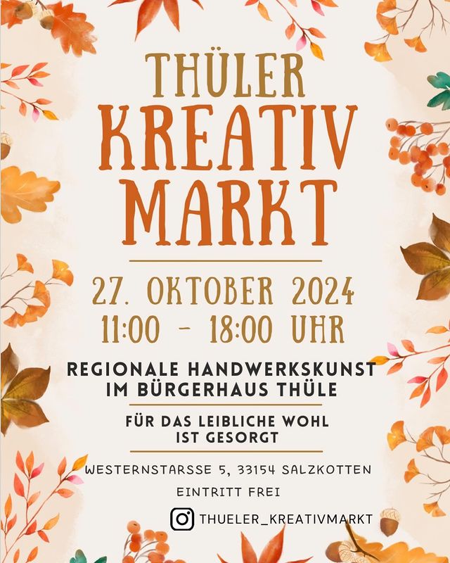 1. Thüler Kreativmarkt 2024 Regionale Handwerkskunst im Bürgerhaus Thüle. Für das leibliche Wohl ist gesorgt. Termin Beginn: 27.10.2024 | 11:00 Uhr Ende: 27.10.2024 | 18:00 Uhr Adresse Bürgerhaus Thüle Westernstraße 5 33154 Salzkotten-Thüle Mehr Informationen Offizielle Website